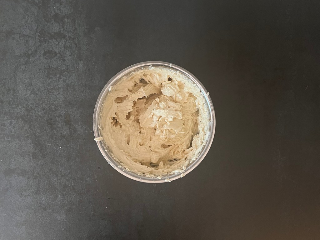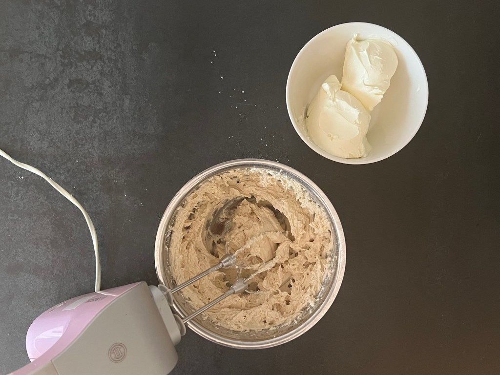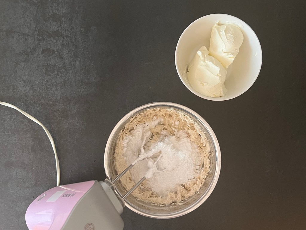 När smöret blivit fast så vispar jag det fluffigt och krämigt med en elvisp, tillsätter sedan citronsaft och florsocker och vispar samman. Sist tillsätter jag färskosten och vispar i ett par minuter.