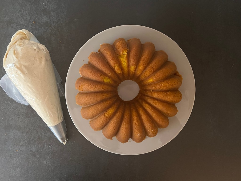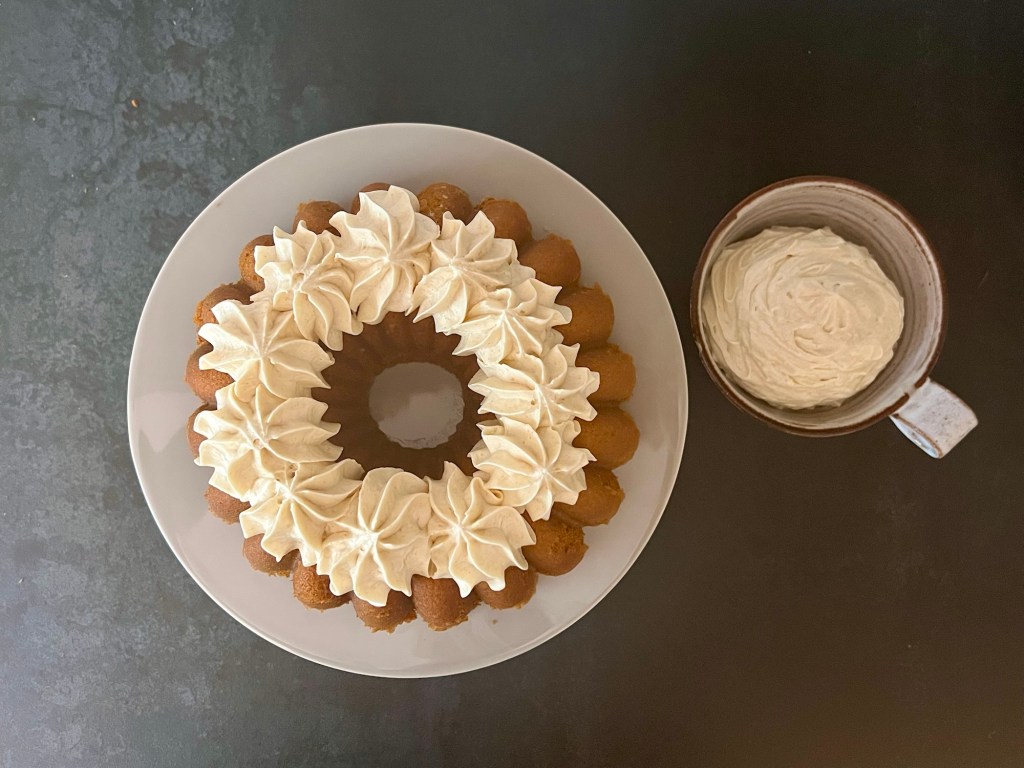Jag för upp frostingen i en spritspåse med en tyll jag gillar, i detta fallet en stor stjärntyll. Flyttar kakan från gallret till ett fat/tårtfat och spritsar toppen på kakan. Överbliven frosting spritsar jag i en skål och serverar med kakan.