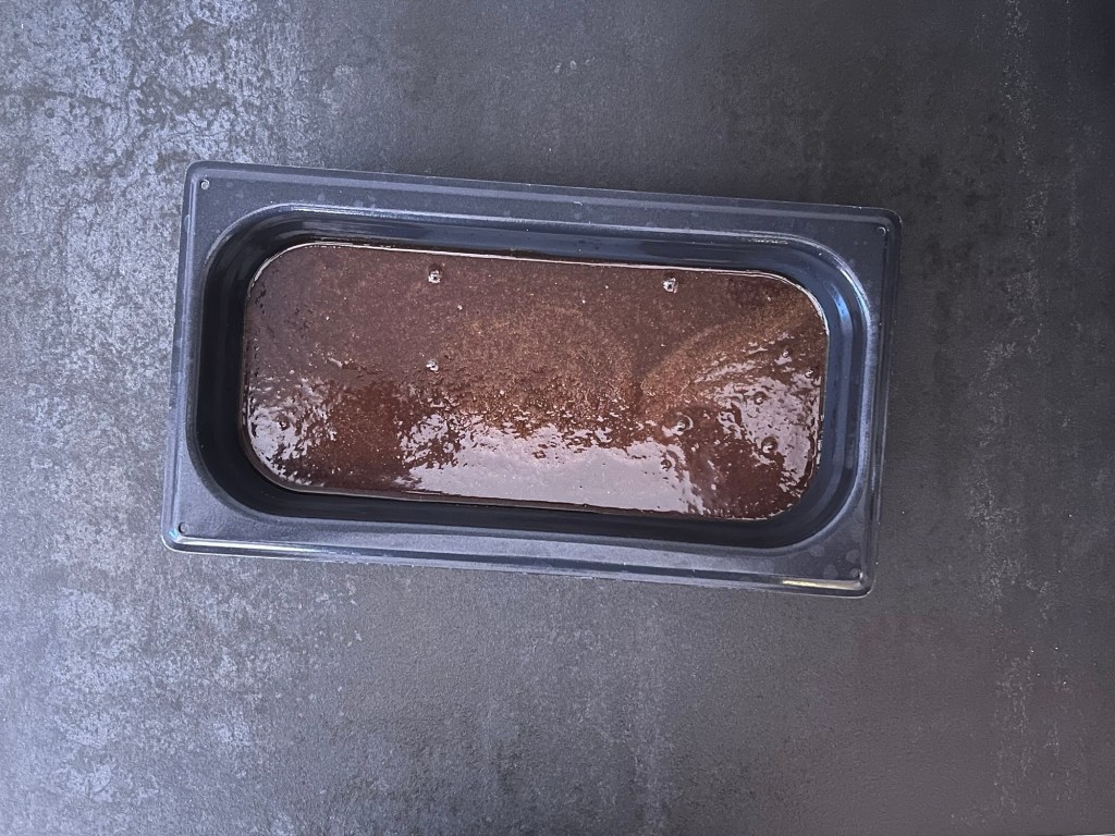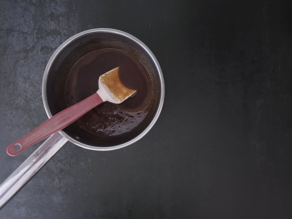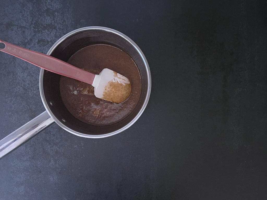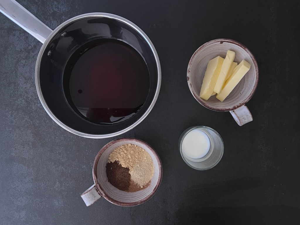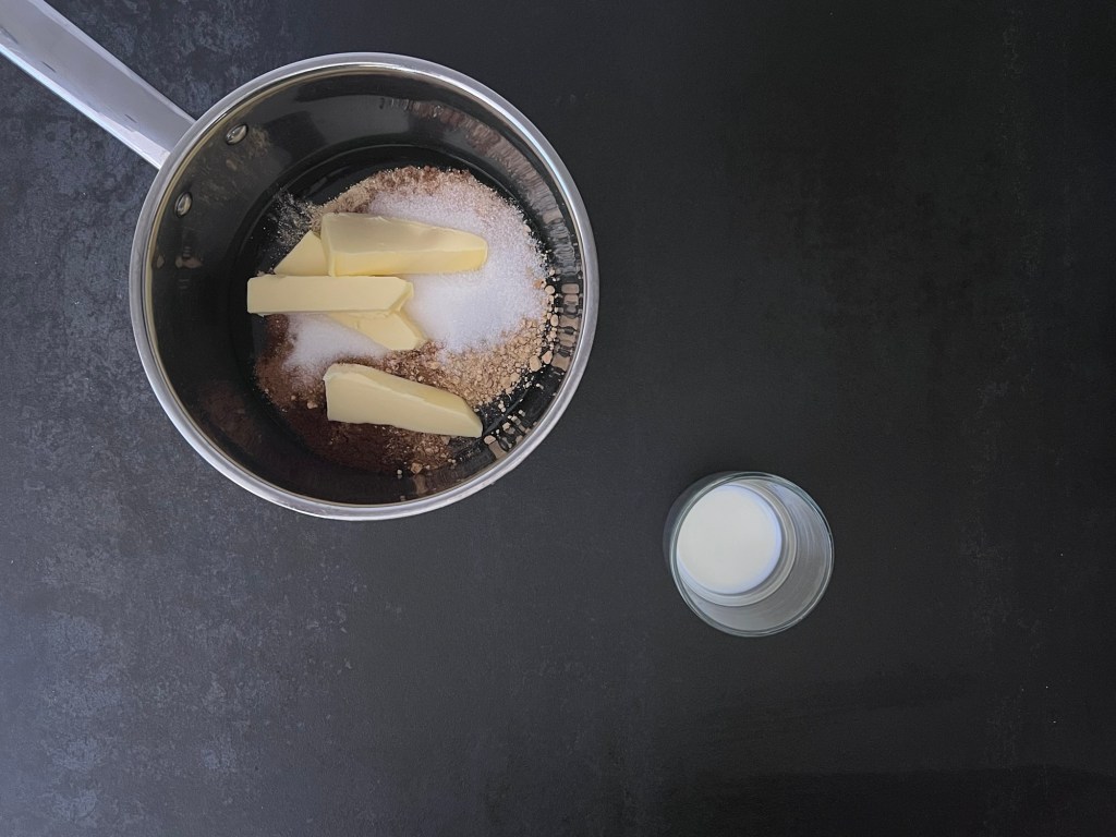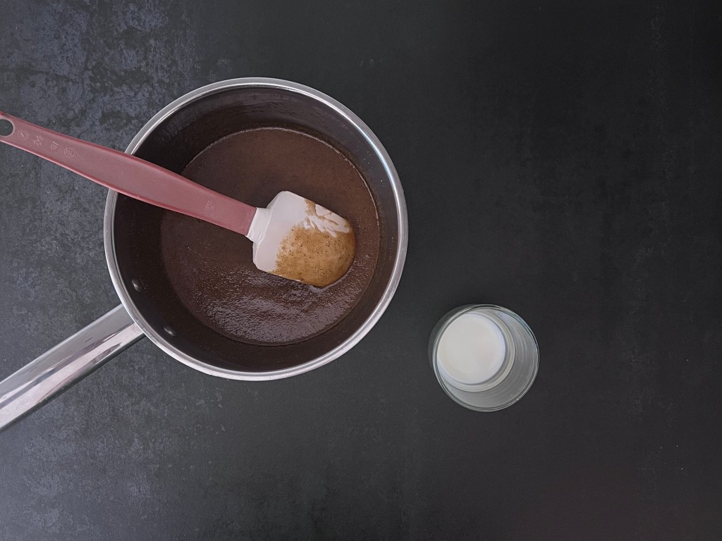 Först gör jag ett uppkok av mörk sirap, kryddor, smör och socker. Tar av från värmen och rör ned mjölken. Sen häller jag över det i en ugnsform och stoppar in den i kylen, så att vätskan får svalna. Det går lika bra att låta den svalna i kastrullen på bänken, men det kommer ta en längre stund.