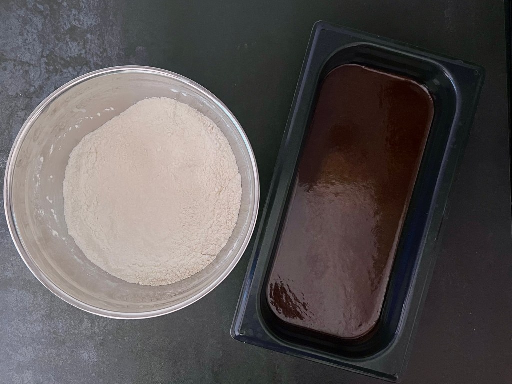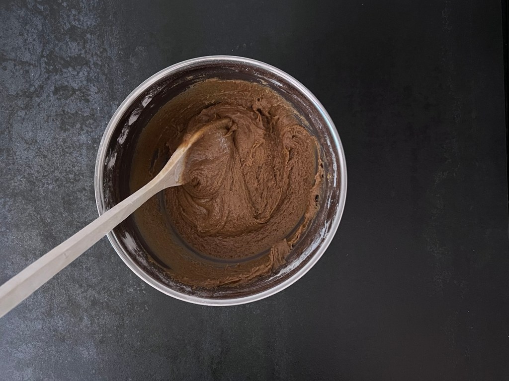 När vätskan svalnar så blandar jag de torra ingredienserna. Sen när koket svalnat så blandar jag ned det i mjölmixen och rör samman med en träslev.