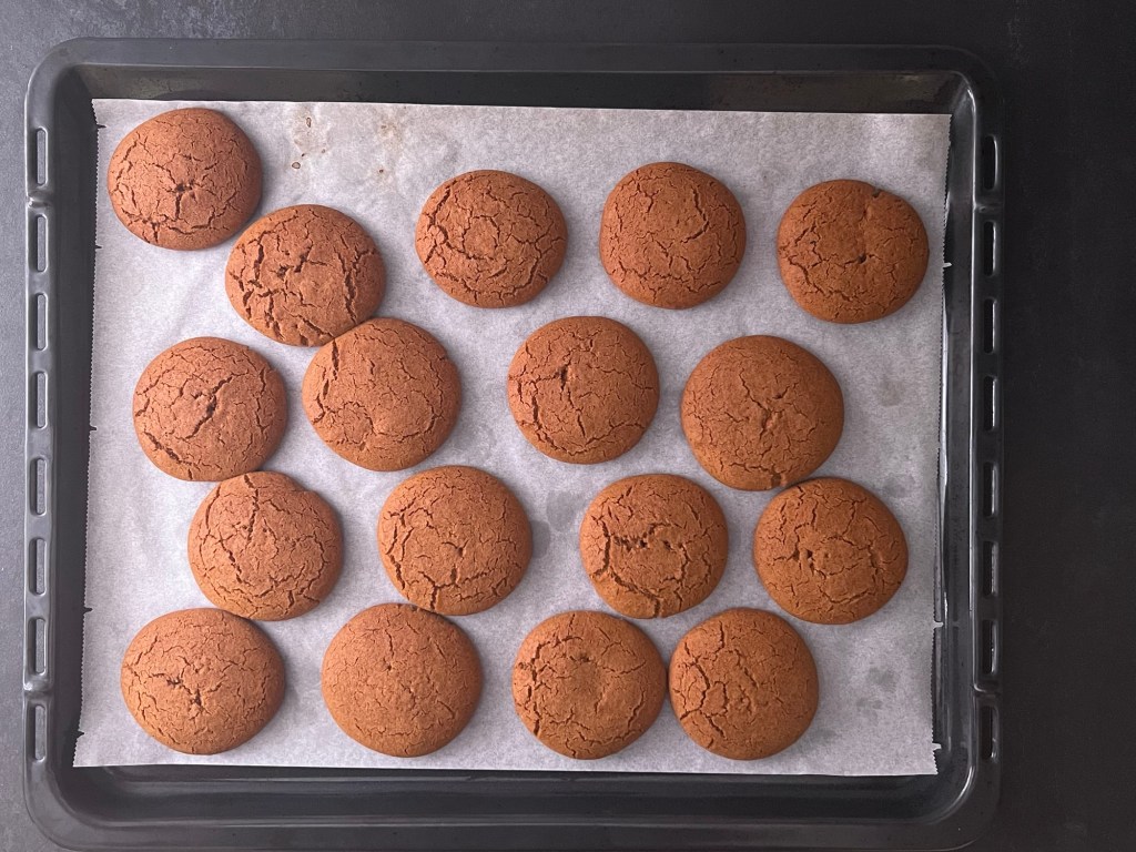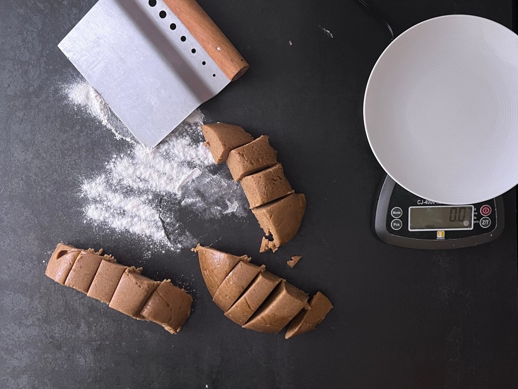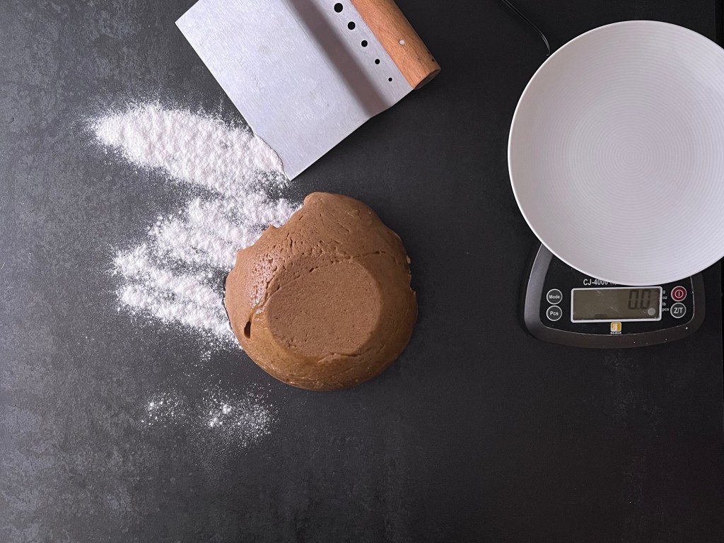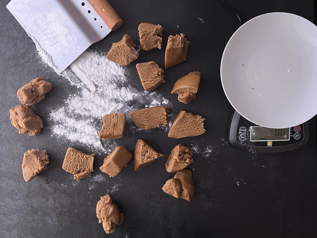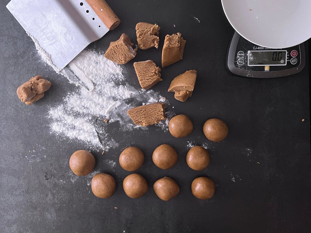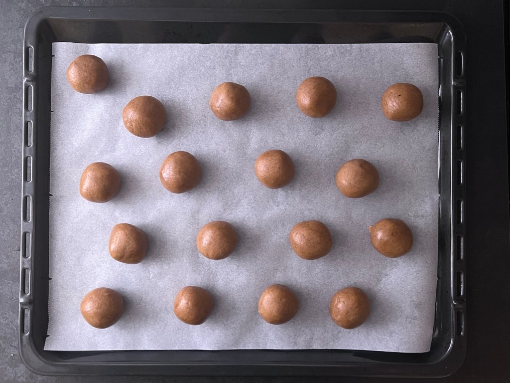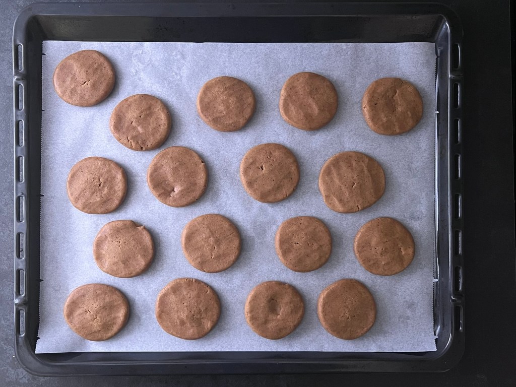 När degen vilat färdigt i kylen så värmer jag ugnen. Under tiden så delar jag upp degen i 17 lika stora bitar, ca 40g styck. Jag rullar dem till jämna bollar och placerar dem på en bakplåtspappersklädd plåt. Plattar ut dem till runda kakor, ca 6cm i diameter och bakar av dem.