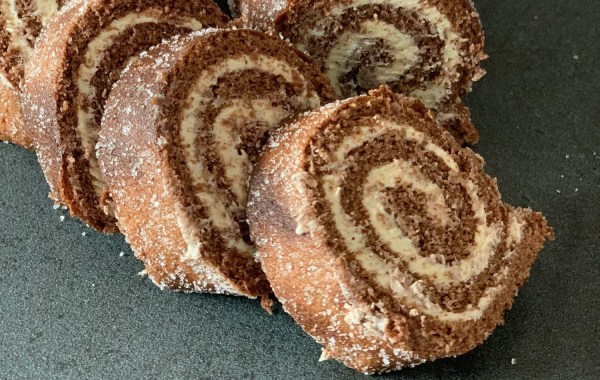 En rulltårta fylld med färskostcreme och hjortronsylt. Smaker som för mig påminner om barndomskvällar hos morfar